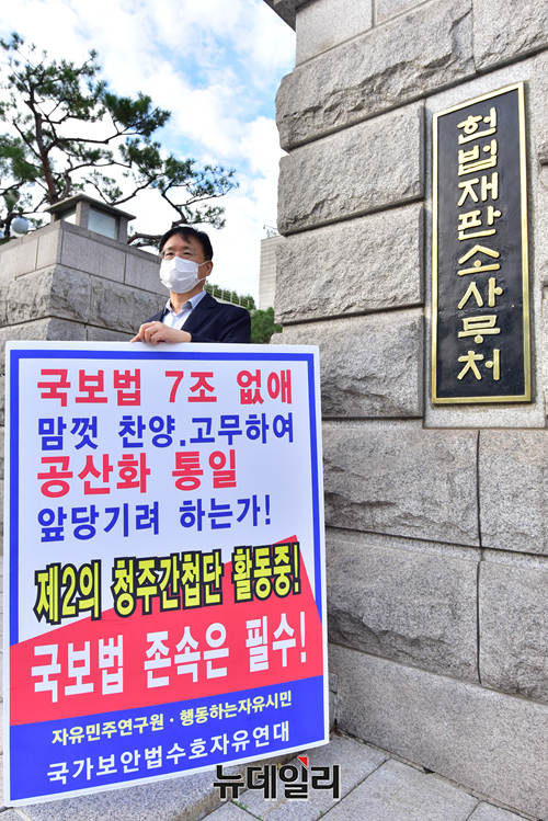 유동열 자유민주연구원 원장이 12일 오전 서울 종로구 헌법재판소 앞에서 국가보안법(국보법) 폐지를 반대하는 릴레이 1인 시위를 31일째 이어가고 있다.