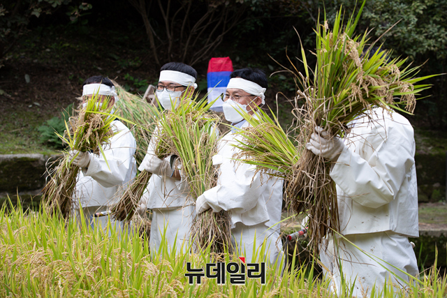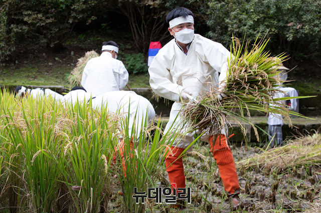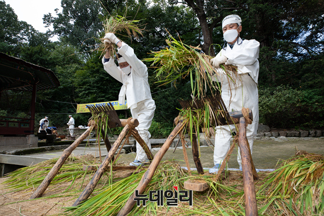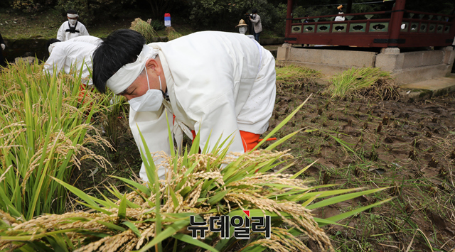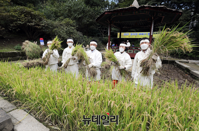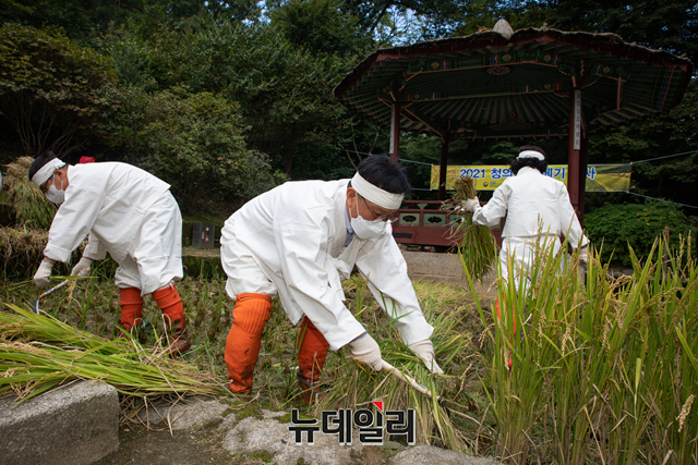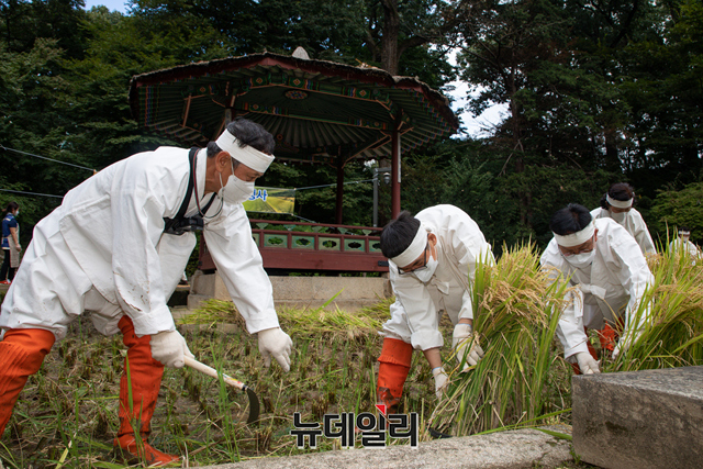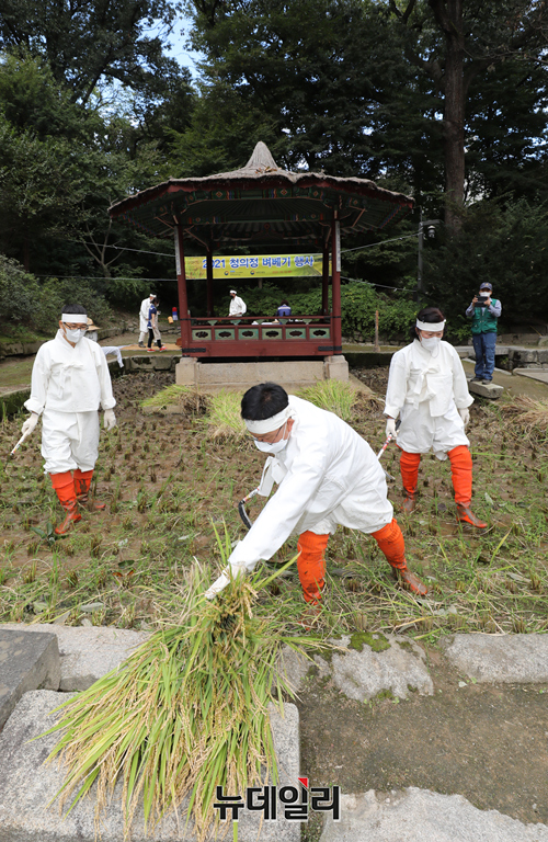 농촌진흥청과 문화재청 관계자가 12일 오전 서울 종로구 창덕궁 옥류청 청의정에서 열린 벼 베기 행사를 진행하고 있다.