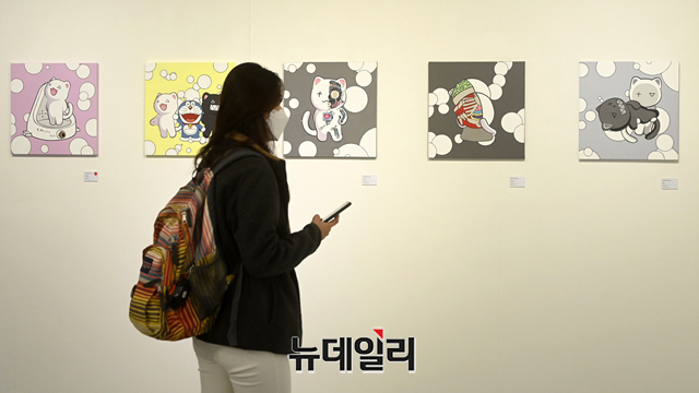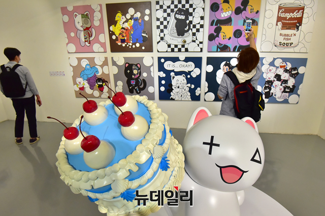 낸시랭 개인전 '버블코코 (Bubble Coco)' 전시회를 찾은 관람객들이 12일 오후 서울 종로구 갤러리그림손에서 팝아티스트 낸시랭(본명 박혜령)과 대화를 나누고 있다.