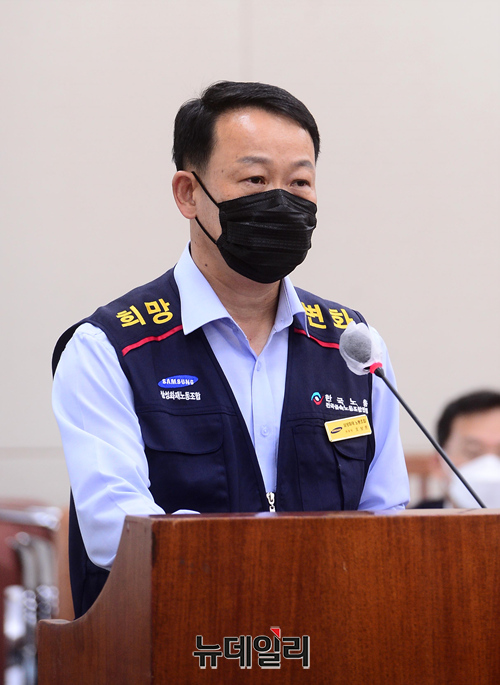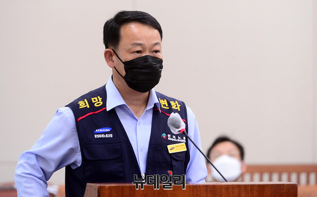 오상훈 삼성화재 노조위원장이 12일 서울 여의도 국회에서 환경노동위원회의 경제사회노동위원회·중앙노동위원회·최저임금위원회 등에 대한 국정감사에서 의원들의 질의에 답하고 있다. (사진=공동취재단)