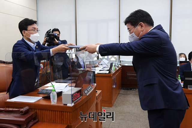 김용진 국민연금공단 이사장이 13일 오전 국회에서 열린 국회 보건복지위원회의 국민연금공단에 대한 2021년도 국정감사에서 선서를 하고 있다. (사진=공동취재단)