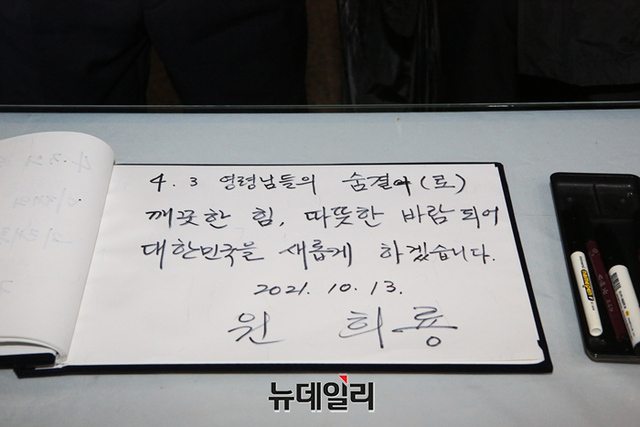 원희룡 국민의힘 대선 예비후보가 13일 오전 제주4.3평화공원을 방문해 참배하고 있다. (사진=원희룡 캠프)