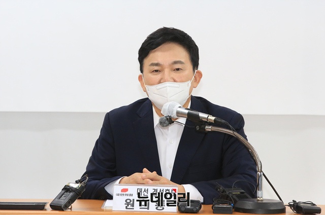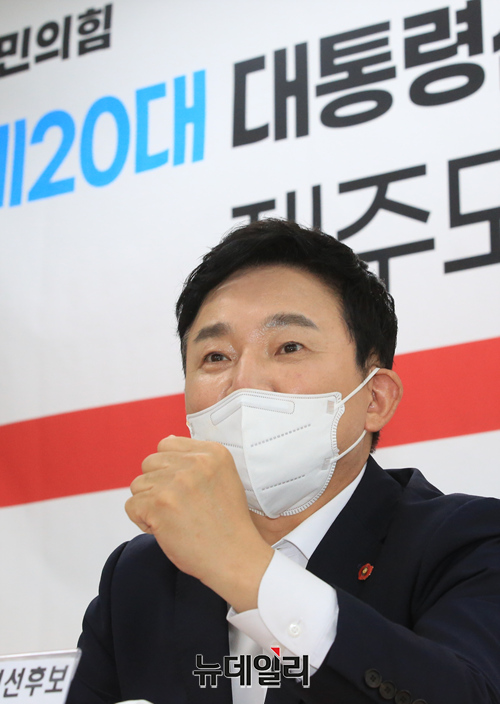 원희룡 국민의힘 대선 예비후보가 13일 오전 제주시 국민의힘 제주도당에서 당직자와 간담회를 갖고 있다. (사진=원희룡 캠프)