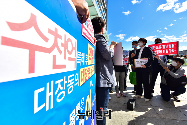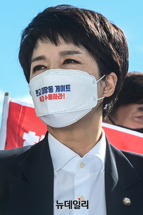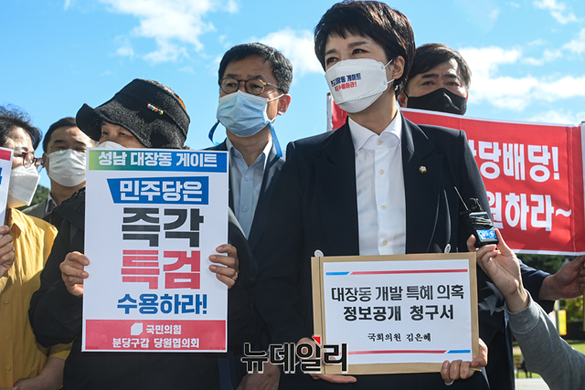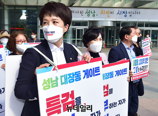 김은혜(성남분당갑) 국민의힘 의원이 13일 오전 경기 성남시청을 항의 방문해 대장동 게이트 특검을 촉구하는 주민들과 대화를 나누고 있다. 이들은 성남시청에 정보공개청구를 하고 야탑역까지 도보행진을 이어갔다. (경기 성남=강민석 기자)