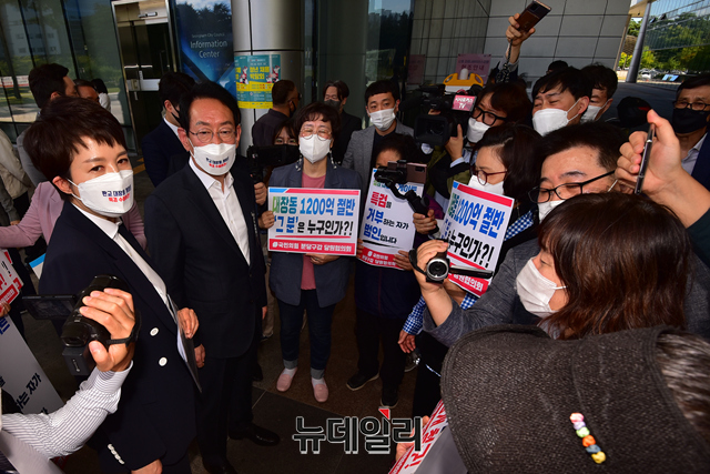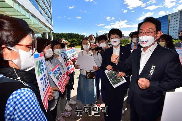 대장동 개발 특혜 의혹 정보공개 청구를 마친 김은혜(성남분당갑) 국민의힘 의원과 김도읍 의원이 13일 오전 경기 성남시청에서 대장동 원주민들과 대화를 나누고 있다.