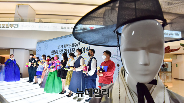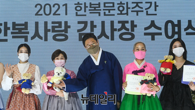 황희 문화체육관광부 장관이 13일 오후 서울 강남구 스타필드 코엑스몰 라이브플라자에서 진행된 2021 한복문화주간 가을 한복사랑 감사장 수여식에서 수상자들과 함께 기념촬영을 갖고 있다.