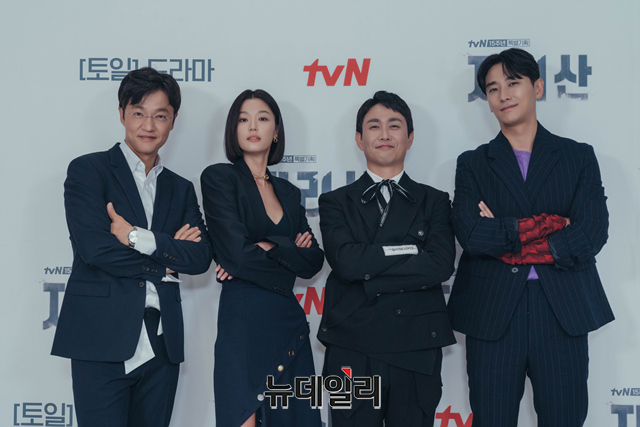 배우 조한철, 전지현, 오정세, 주지훈(왼쪽부터)이 13일 오후 온라인으로 진행된 tvN 15주년 특별기획 '지리산(김은희 극본, 이응복 연출)' 제작발표회에서 포즈를 취하고 있다.