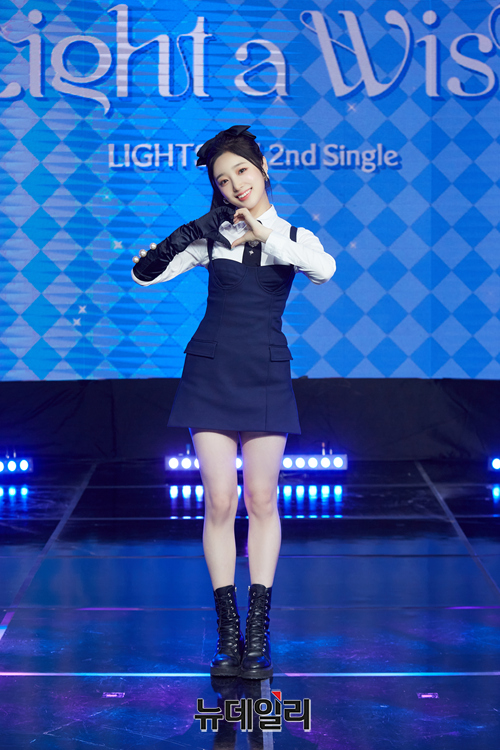 걸그룹 라잇썸 멤버 히나가 13일 오후 온라인으로 진행된 두 번째 싱글 '라잇 어 위시(Light a Wish)' 발매 기념 쇼케이스에서 포즈를 취하고 있다.