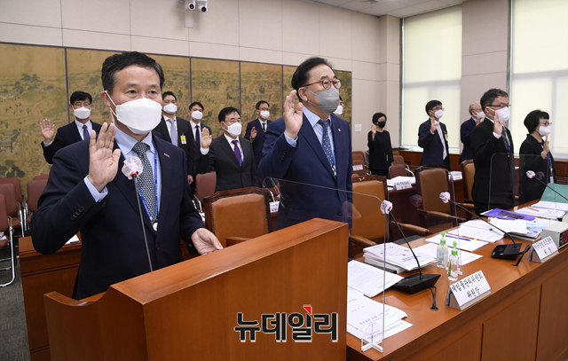 조현래 한국콘텐츠진흥원 원장을 비롯한 관계자들이 14일 국회에서 열린 2021 문화체육관광위원회 국정감사에서 선서를 하고 있다. (사진=공동취재단)