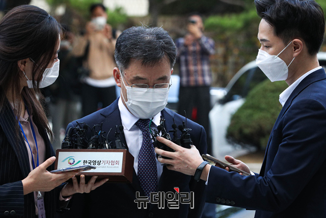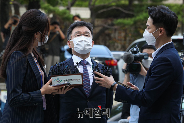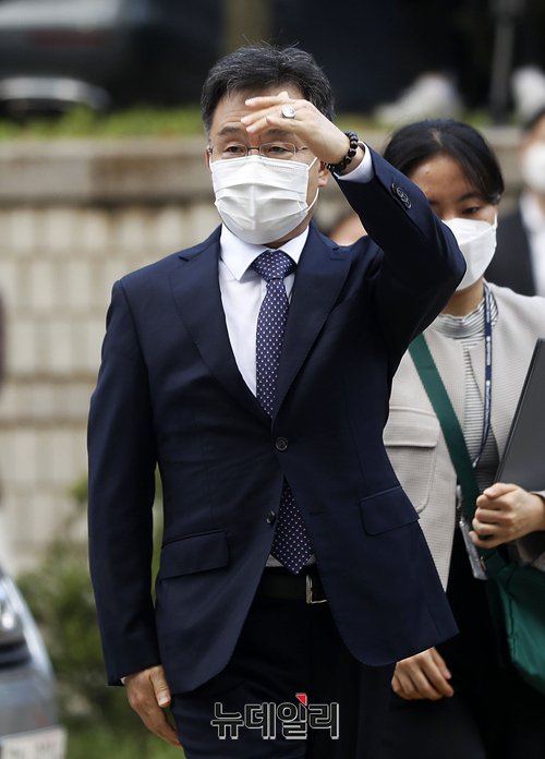 성남 대장동 개발사업 특혜 의혹을 받고 있는 화천대유 대주주 김민배 씨가 14일 오전 서울 서초구 서울중앙지방법원에서 열린 구속 전 피의자 심문에 출석하기 위해 입장하고 있다.