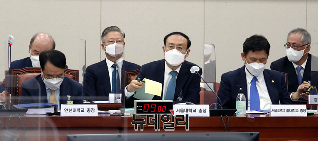 오세정 서울대학교 총장이 14일 오전 국회에서 열린 교육위원회의 국립대학법인 서울대학교, 국립대학법인 인천대학교, 한국방송통신대학교, 서울교육대학교 등 국정감사에서 의원 질의에 답하고 있다. (사진=공동취재단)
