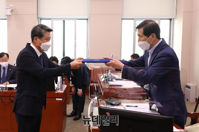김학도 중소벤처기업진흥공단 이사장이 14일 국회에서 열린 산업통상자원주옷벤처기업위원회의 중소벤처기업진흥공단, 소상공인시장진흥공단, 기술보증기금 등에 대한 국정감사에서 선서를 하고 있다. (사진=공동취재단)