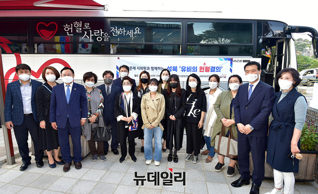 성북학부모협의회가 14일 오후 서울 성북역사문화센터에서 헌혈 봉사에 앞서 기념촬영을 하고 있다.
