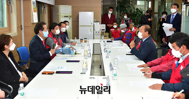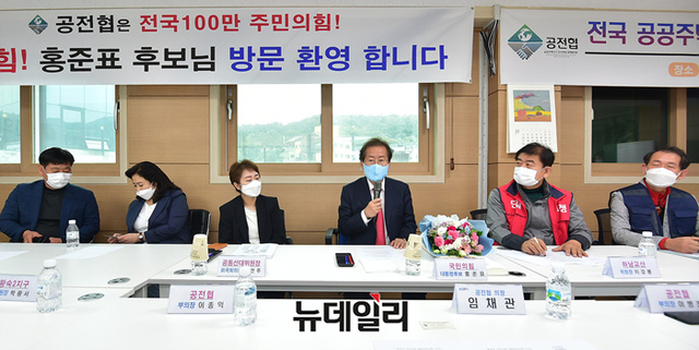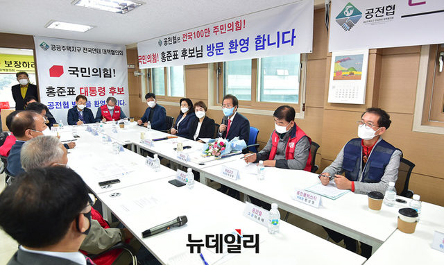 홍준표 국민의힘 대선 예비후보가 16일 오후 경기 성남시 공공주택지구 전국연대 대책협의회 사무실을 방문해 지도부와 간담회를 갖고 있다. 홍 후보는 공전협 측의 요구사항을 일부 수용해 불합리한 부분에 대한 호소를 새겨 듣겠다고 밝혔다.이언주 공동선대위원장은 "대장동 게이트처럼 공공개발을 빌미로 원주민들의 토지를 헐값에 빼앗는 경우가 많은데 무분별한 신도시 개발이 모두 좋은 것이 아니다"며 "기존의 서울과 경기 도심의 재개발 활성화를 통해서 재탄생 시키고 외곽은 외곽대로 그 특성을 잘 살리는 등 다양한 국토 개발이 필요하다"고 말했다.홍 후보는 "특히 강제 수용은 자발적 거래가 아닌데 그 경우에도 양도소득세를 부과하는것은 문제가 있으며 집권하면 양도세 감면폭을 넓히는 부분에 대해 적극 검토하겠다"고 밝혔다. (경기 성남 =정상윤 기자)