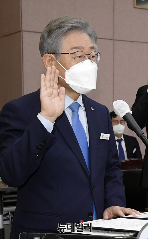 더불어민주당 대선 후보인 이재명 경기지사가 18일 오전 경기 수원시 경기도청에서 열린 국회 행정안전위원회의 경기도에 대한 국정감사에서 선서를 하고 있다. (사진=공동취재단)