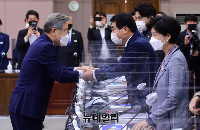 더불어민주당 대선 후보인 이재명 경기지사가 18일 오전 경기 수원시 경기도청에서 열린 국회 행정안전위원회의 경기도에 대한 국정감사에서 의원들과 인사를 나누고 있다. (사진=공동취재단)