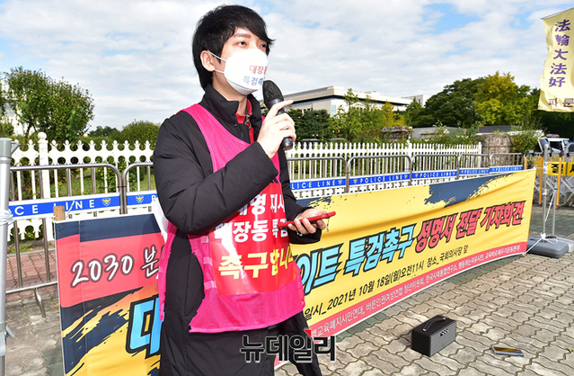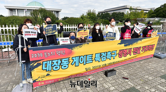 청년단체 '티네렛(TINERET)'의 회원들이 18일 오전 서울 여의도 국회의사당 정문 앞에서 대장동 게이트 특검을 촉구하며 진행한 행진을 마치고 기자회견을 갖고 있다.