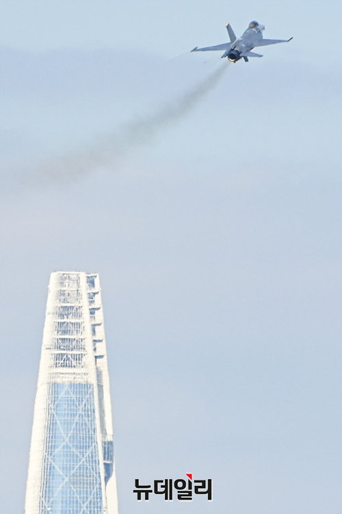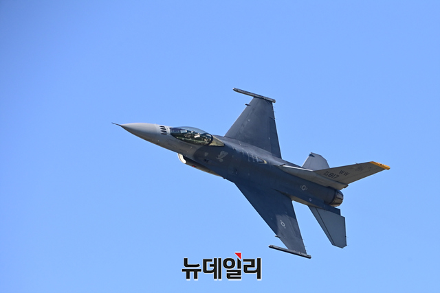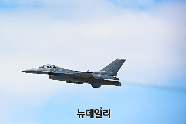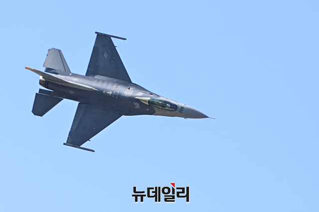 미 공군의 전투기 F-16(파이팅 팰컨)이 18일 오후 경기 성남 서울공항에서 열린 '서울 아덱스(ADEX) 2021' 미디어데이에서 단기 기동을 하고 있다.