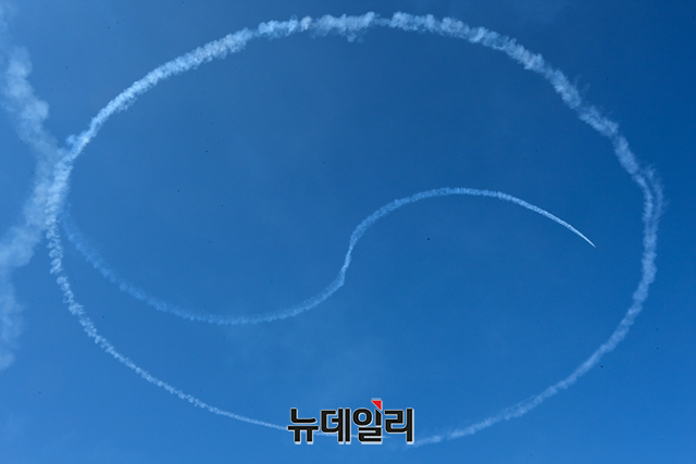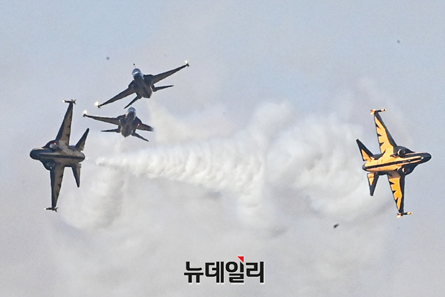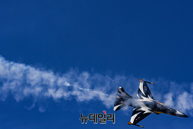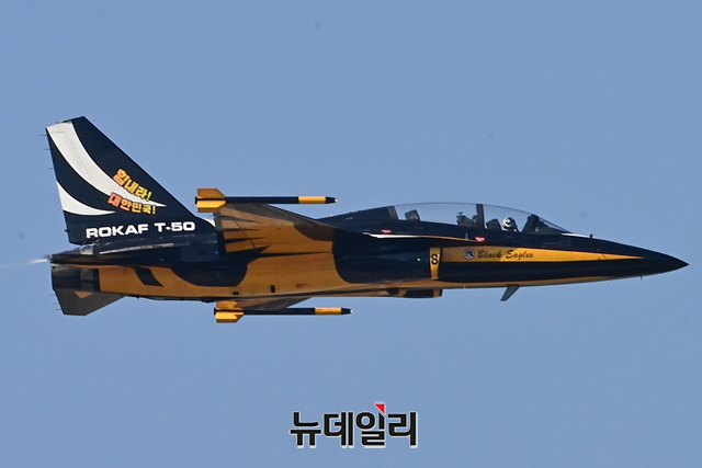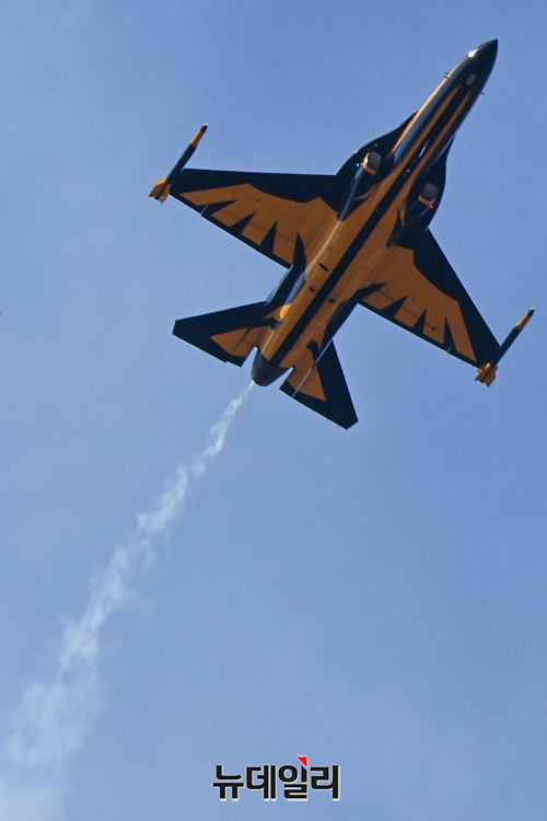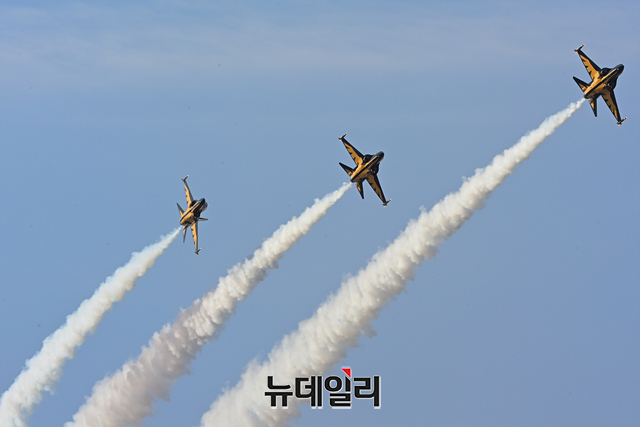 우리공군 특수비행팀 블랙이글스가 18일 오전 경기 성남 서울공항에서 열린 '서울 아덱스(ADEX) 2021' 미디어데이에서 곡예 비행을 하고 있다.