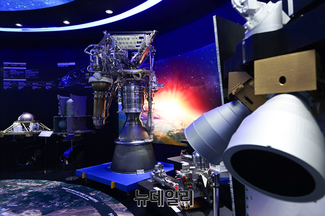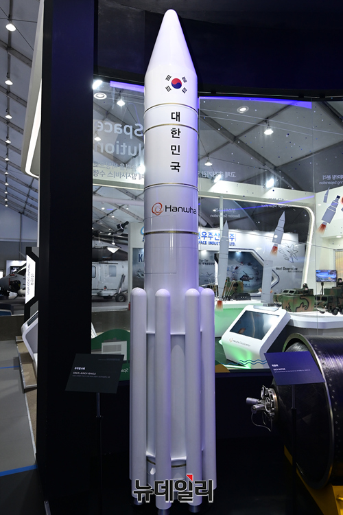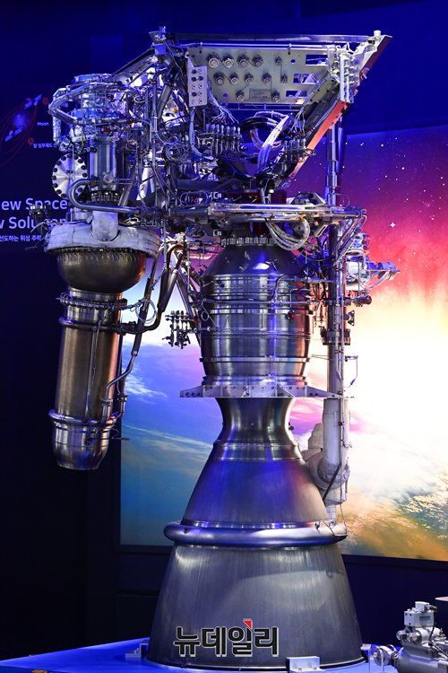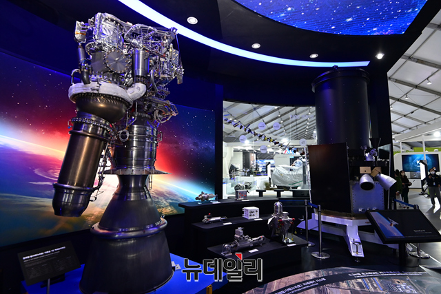 한화가 21일 발사되는 누리호의 심장 '75톤 액체로켓 엔진' 실물을 18일 오전 경기 성남시 서울공항에서 열린 '서울 아덱스(ADEX) 2021'에서 공개했다.'75톤 액체로켓 엔진'은 한국항공우주연구원 주도로 2010년부터 한국이 독자 개발한 누리호의 핵심 장치이다. 누리호는 21일 전남 고흥군 나로우주센터에서 발사될 예정이다.국내 최대 항공우주 및 방위산업 전시회 '서울 아덱스 2021'는 '포스트 코로나 글로벌 국가로 도약하는 항공우주 및 방위산업'를 주제로 19일부터 23일까지 서울공항에서 5일간의 일정으로 개최된다. (경기 성남=강민석 기자)