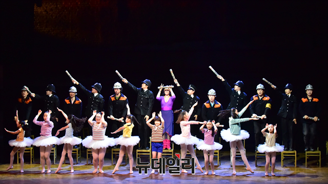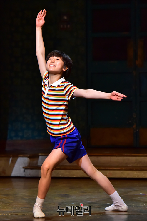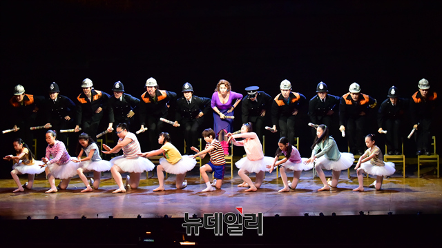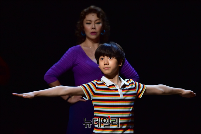 빌리 역을 맡은 김시훈, 미세스 윌킨슨 역을 맡은 김영주, 풀 컴퍼니가 18일 오후 서울 구로구 디큐브아트센터에서 열린 뮤지컬 '빌리 엘리어트(총괄 박명성)' 프레스콜에서 하이라이트 장면을 선보이고 있다.'빌리 엘리어트'는 80년대 광부 대파업 시기의 영국 북부 탄광촌을 배경으로 복싱 수업 중 우연히 접한 발레를 통해 자신의 재능을 발견하고, 꿈을 이뤄가는 소년 '빌리'의 여정을 다룬 뮤지컬이다. 내년 2월 2일까지 대성디큐브아트센터에서 열린다.