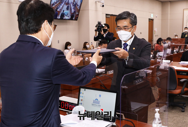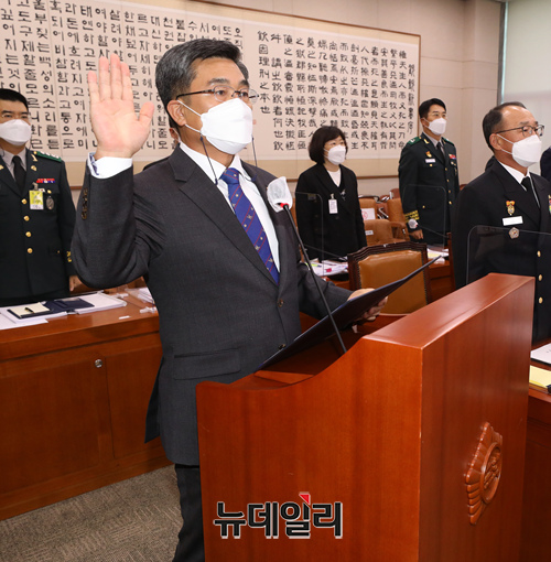 서욱 국방부장관과 3군 총장이 19일 오후 국회에서 열린 법제사법위원회의 군사법원에 대한 국정감사에서 선서를 하고 있다. (왼쪽부터 서 장관, 부석종 해군참모총장, 남영신 육군참모총장, 박인호 공군참모총장) (사진=공동취재단)