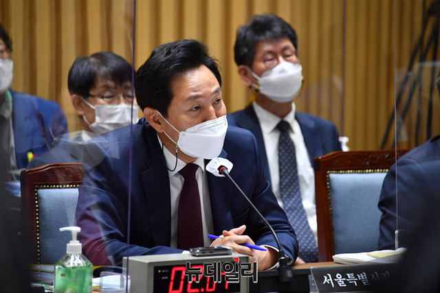오세훈 서울시장이 19일 서울 중구 서울시청에서 열린 국회 행정안전위원회의 서울시 국정감사에 앞서 증인선서를 하고 있다. (사진=서울시)