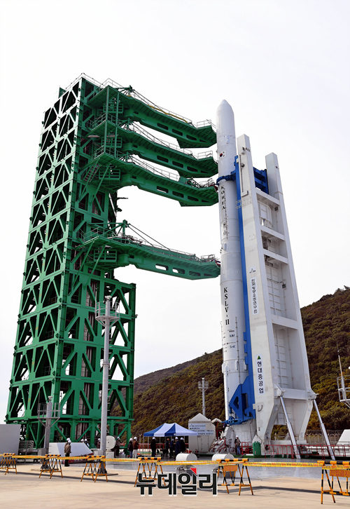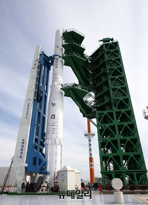 순수 우리기술로 제작된 한국형 우주발사체 누리호가 발사를 하루 앞둔 20일 오전 전남 고흥군 나로우주센터 제2발사대에 기립돼 있다. (사진=한국항공우주연구원)