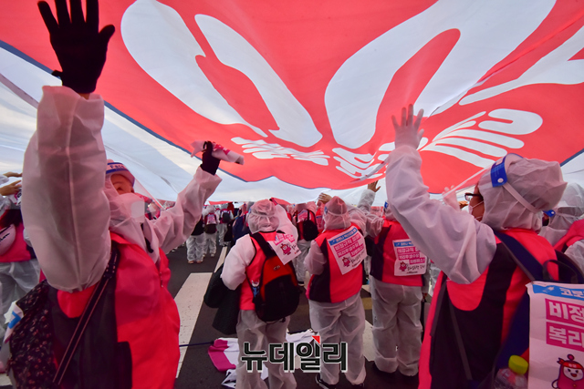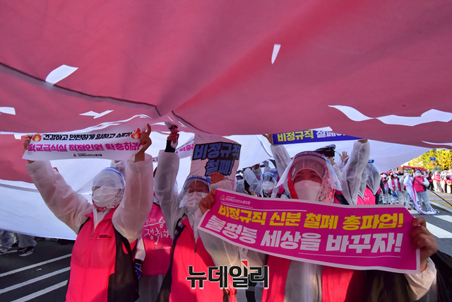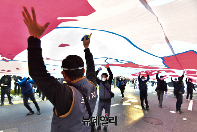 민노총이 총파업을 강행한 20일 오후 서울 도심 일대에 집결해 비정규직 철폐 등을 촉구하는 대형현수막을 펼치는 퍼포먼스를 하고 있다.