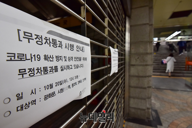 민노총이 총파업을 강행한 20일 오후 서울 종로구 경복궁역에서 무정차통과 시행 안내문이 부착돼 있다.