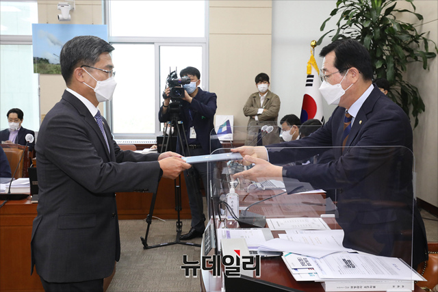 서욱 국방부 장관이 21일 오전 국회에서 열린 국회 국방위원회 2021년도 종합국정감사에서 증인선서를 하고 있다. (사진=공동취재단)
