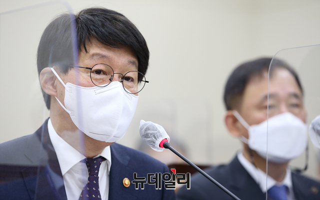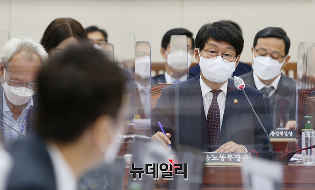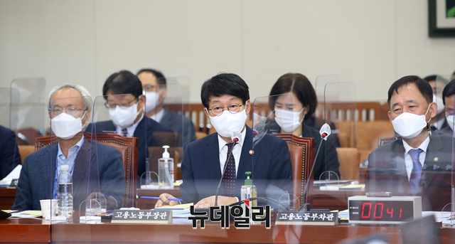 안경덕 고용노동부 장관이 21일 오전 국회에서 열린 2021 환경노동위원회의 고용노동부 종합감사에서 의원들의 질의에 답하고 있다. (사진=공동취재단)