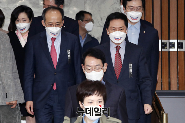 김기현 국민의힘 원내대표를 비롯한 당 원내지도부가 22일 오전 국회에서 열린 국민의힘 국정감사대책회의에 참석하고 있다. (사진=공동취재단)