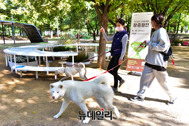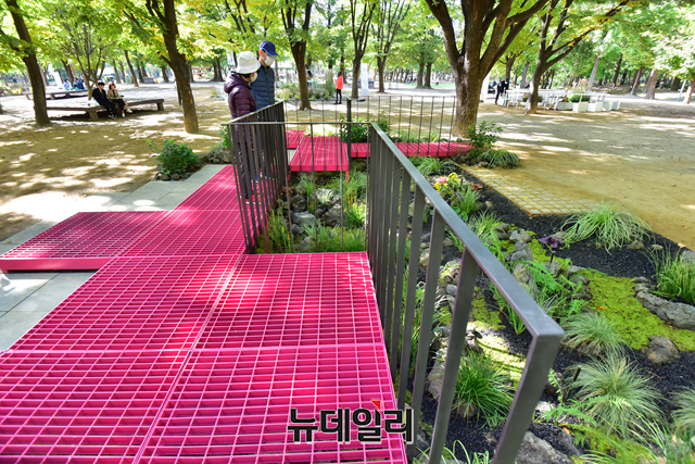 '72시간 프로젝트 왕중왕전'을 찾은 시민들이 22일 오후 서울 성동구 서울숲에 설치된 작품을 관람하고 있다.