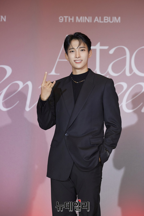 아이돌그룹 세븐틴 도겸이 22일 서울 여의도 콘래드 서울에서 열린 미니 9집 'Attacca(아타카)' 발매 기념 글로벌 기자간담회에서 포토타임을 갖고 있다.