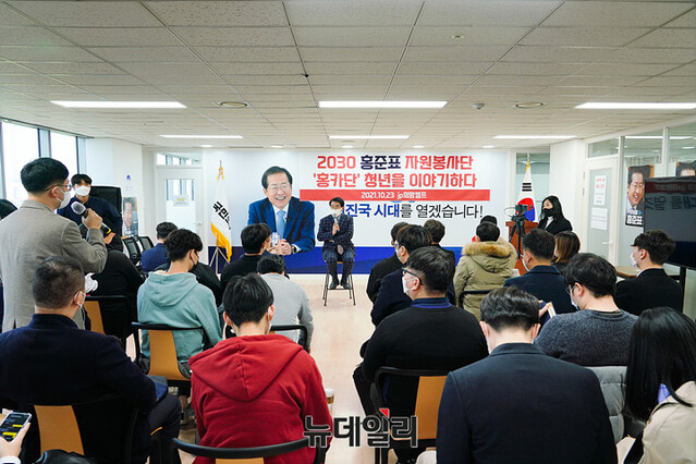 홍준표 국민의힘 대선 경선 후보가 지난 23일 오전 서울 여의도 jp희망캠프 사무실에서 열린 2030 자원봉사단 '홍카단' 임명장 수여식에 입장하고 있다.