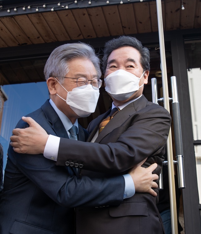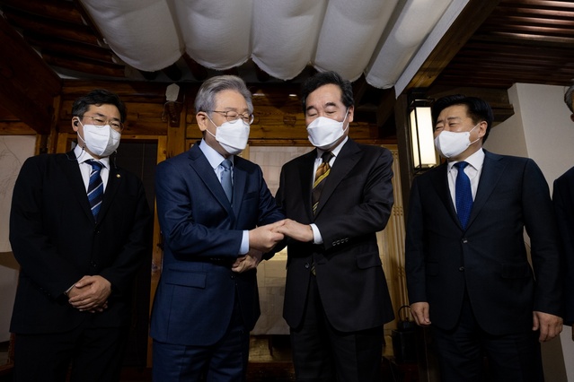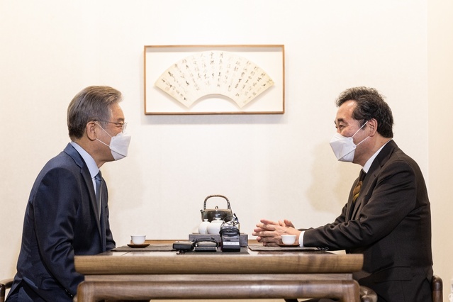 이재명 더불어민주당 대선 후보가 24일 오후 서울 종로구 안국동의 한 찻집에서 이낙연 전 예비후보와 회동을 갖고 있다. 이낙연 전 후보는 이날 이재명 후보 선대위 상임고문을 맡기로 했다. (사진=이재명 캠프)