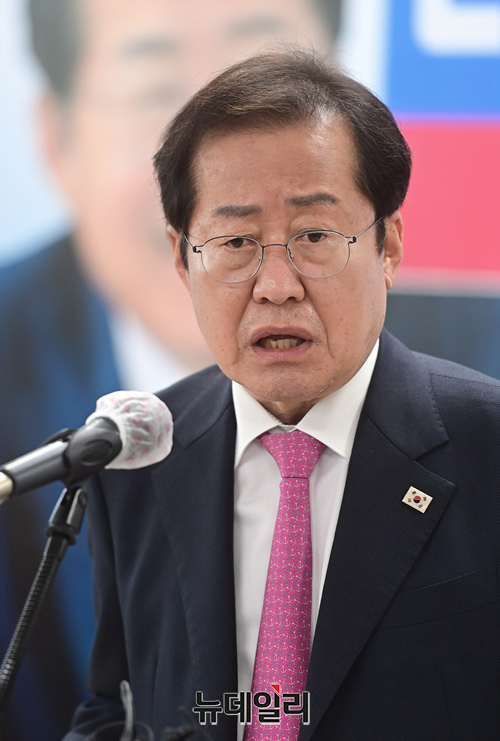 홍준표 국민의힘 대선후보가 26일 오후 서울 여의도 jp희망캠프에서 안보·국방 대개혁 공약발표를 하고 있다.이날 홍 후보가 발표한 '안보 국방의 대전환' 7대 방안은 △대북정책의 기본은 '남북불간섭과 체제경쟁주의'로 전환 △취임 즉시 9.19 남북군사합의를 파기 △남북 군사력 균형을 회복, 무장평화 추구 △육·해·공·해병특수군 4군 체제 확립 △국방과학연구소(ADD) 역량 극대화 △사이버전 대응 역량 강화 △선진군대, 효율적인 군대 확립 등이다.