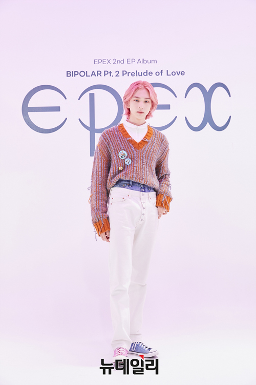아이돌그룹 이펙스(EPEX) 멤버 백승이 26일 오후 온라인으로 진행된 두 번째 EP 앨범 '양극성(Bipolar) Pt.2 사랑의 서' 발매 기념 쇼케이스에서 포즈를 취하고 있다.
