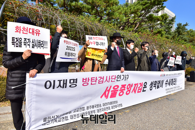 클린선거시민행동이 27일 오후 서울 서초구 서울중앙지방검찰청 정문 앞에서 이재명 더불어민주당 대선 후보의 대장동 화천대유 게이트 특검을 촉구하는 기자회견에서 구호를 외치고 있다.