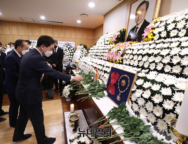 김기현 국민의힘 원내대표가 27일 서울 종로구 서울대병원 장례식장에 마련된 고 노태우 전 대통령의 빈소를 찾아 조문하고 유족들을 위로하고 있다. (사진=공동취재단)