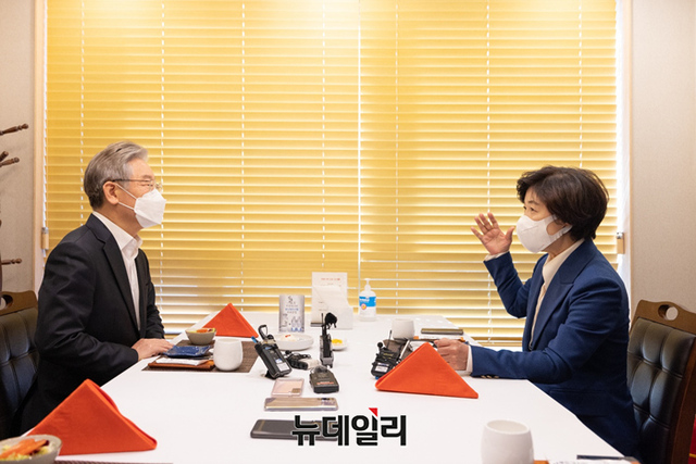 이재명 더불어민주당 대선 후보가 27일 정오 서울 여의도의 한 식당에서 추미애 전 대표와 오찬 회동을 갖고 있다. (사진=이재명 캠프)