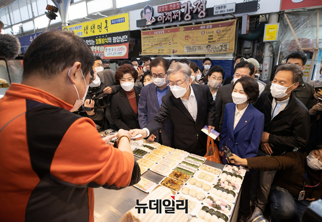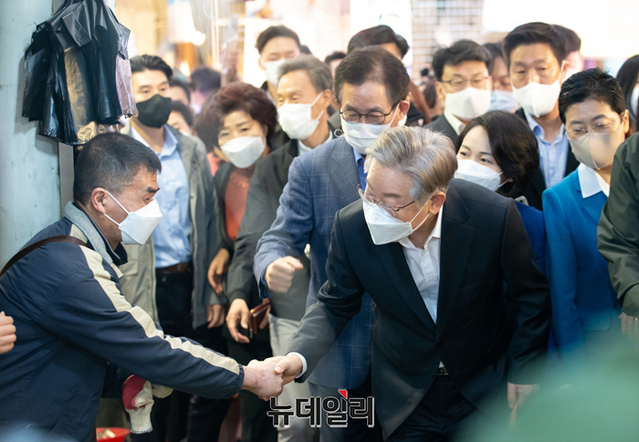 이재명 더불어민주당 대선 후보가 27일 오전 서울 과안구 신원시장을 방문해 상인들에게 인사를 나누고 있다. (사진=이재명 캠프)