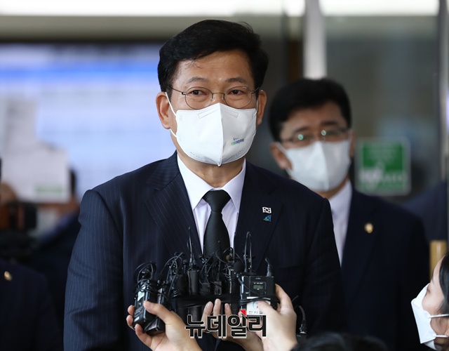 송영길 더불어민주당 대표가 27일 오후 서울 종로구 서울대병원 장례식장에 마련된 노태우 전 대통령의 빈소를 찾아 조문을 마치고 취재진 질문에 답하고 있다. (사진=공동취재단)