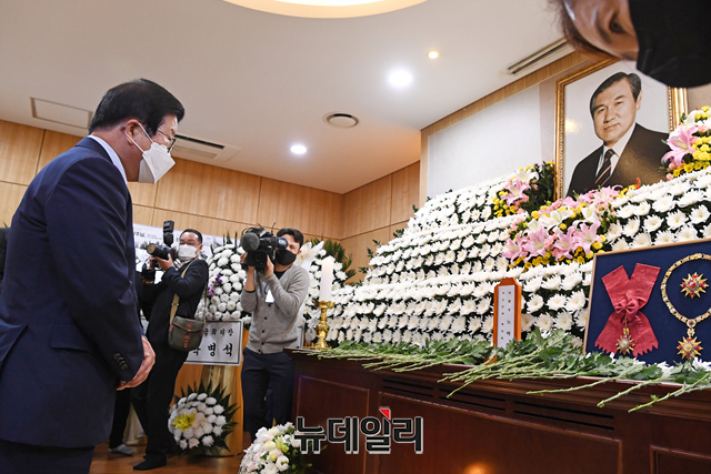 박병석 국회의장이 27일 오후 서울 종로구 서울대병원 장례식장에 마련된 고 노태우 전 대통령의 빈소를 찾아 조문하고 유족들과 대화를 나누고 있다. (사진=공동취재단)