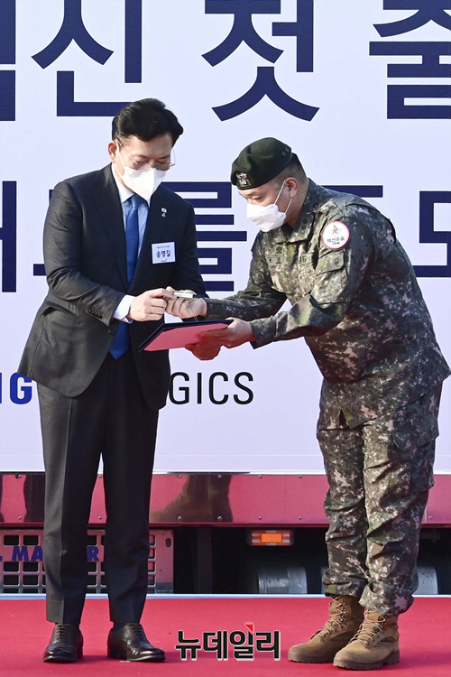 송영길 더불어민주당 대표(오른쪽)와 권덕철 보건복지부 장관이 28일 오전 인천 연수구 삼성바이오로직스 모더나 백신 출하식에서 백신수송지원팀 보고를 받고 서명하고 있다. (인천=강민석 기자)