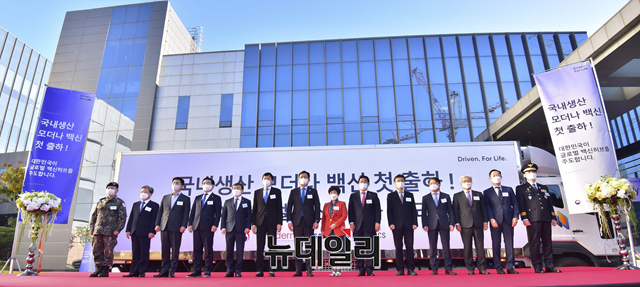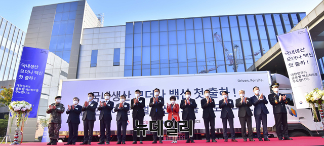 이날 출하식에는 박주경 수송지원본부장, 이원재 인천경제자유구역청장, 조택상 인천광역시 부시장, 정일영 더불어민주당 의원, 권덕철 복지부 장관, 존 림 삼성바이오로직스 대표이사 사장, 송영길 더불어민주당 대표, 전혜숙 더불어민주당 의원, 배준영 국민의힘 의원, 김헌주 질병관리청 차장, 우영택 경인지방식품의약품안전청 청장, 이인용 삼성전자 사장, 고한승 삼성바이오에피스 대표이사 사장 등이 참석했다. (인천=강민석 기자) -