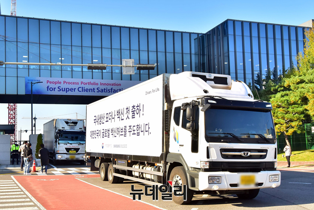 삼성바이오로직스가 위탁 생산한 모더나사의 코로나19 백신이 국내에 처음 공급된 28일 오전 인천 연수구 삼성바이오로직스에서 모더나 백신수송차량이 이송되고 있다. (인천=강민석 기자)