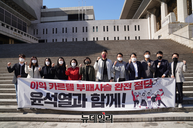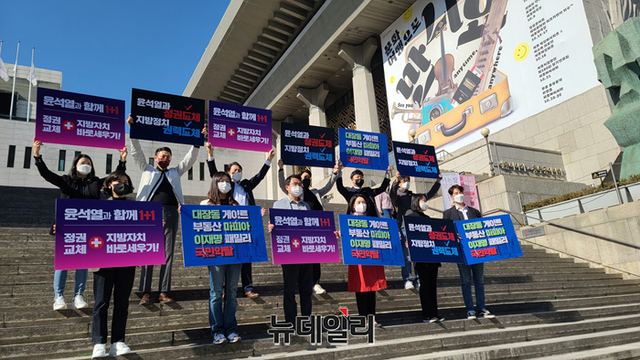 국민의힘 전·현직 청년지방의회 의원 25명이 28일 서울 종로구 세종문화회관 계단에서 윤석열 대선 예비후보를 지지선언하는 퍼포먼스를 선보이고 있다. (사진=윤석열 캠프)