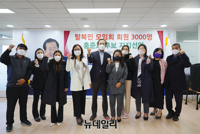 탈북민모임회 회원 3,000명의 대표단이 28일 서울 여의도 jp희망캠프에서 홍준표 국민의힘 대선 예비후보 지지선언을 하고 있다. 앞서 26일에는 최정훈 남북통일당 대표와 탈북민 전국총연합회 3만 회원이 홍 후보를 지지선언한 바 있다. (사진=홍준표 캠프)